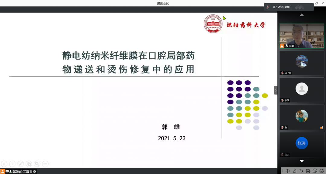 在秦斌教授与与会师生进行交流后,博士后郭雄以《静电纺纳米纤维膜在口腔局部药物递送和烫伤修复中的应用》为题做学术分享,郭雄博士后的分享主要包括静电纺纳米纤维的制备、在口腔药物递送、组织修复中的应用和含ALA静电纺纳米纤维伤口敷料对深二度烫伤的修复三部分内容。随后与会师生同郭雄进行了交流探讨。