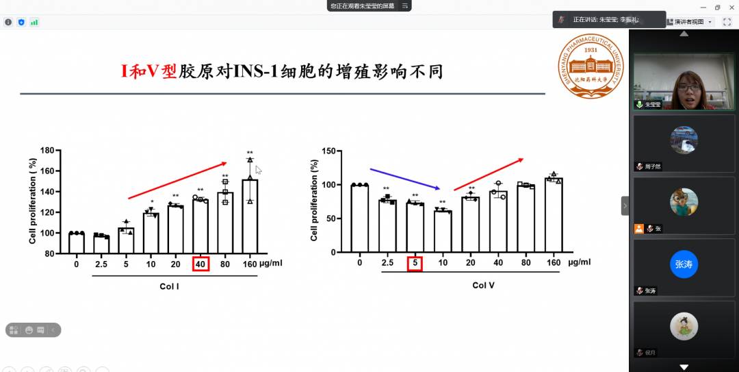 接下来,博士生朱莹莹以《胶原调节大鼠胰岛β细胞(INS-1)增殖和功能的机制研究》为题作学术交流。最后,与会师生与朱莹莹就报告主题进行了交流研讨。