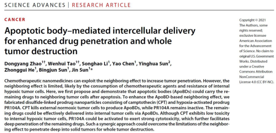 近期,beat365在线唯一官网孙进教授和何仲贵教授课题组发现凋亡小体可以介导肿瘤细胞间的药物传递,借助于此可以增强纳米化疗药物的肿瘤渗透能力以实现肿瘤的全面杀伤。相关研究成果以“Apoptotic body–mediated intercellular delivery for enhanced drug penetration and whole tumor destruction”为题在线发表于Science系列子刊Sciences Advances (IF 13.116, DOI: 10.1126/sciadv.abg0880)。