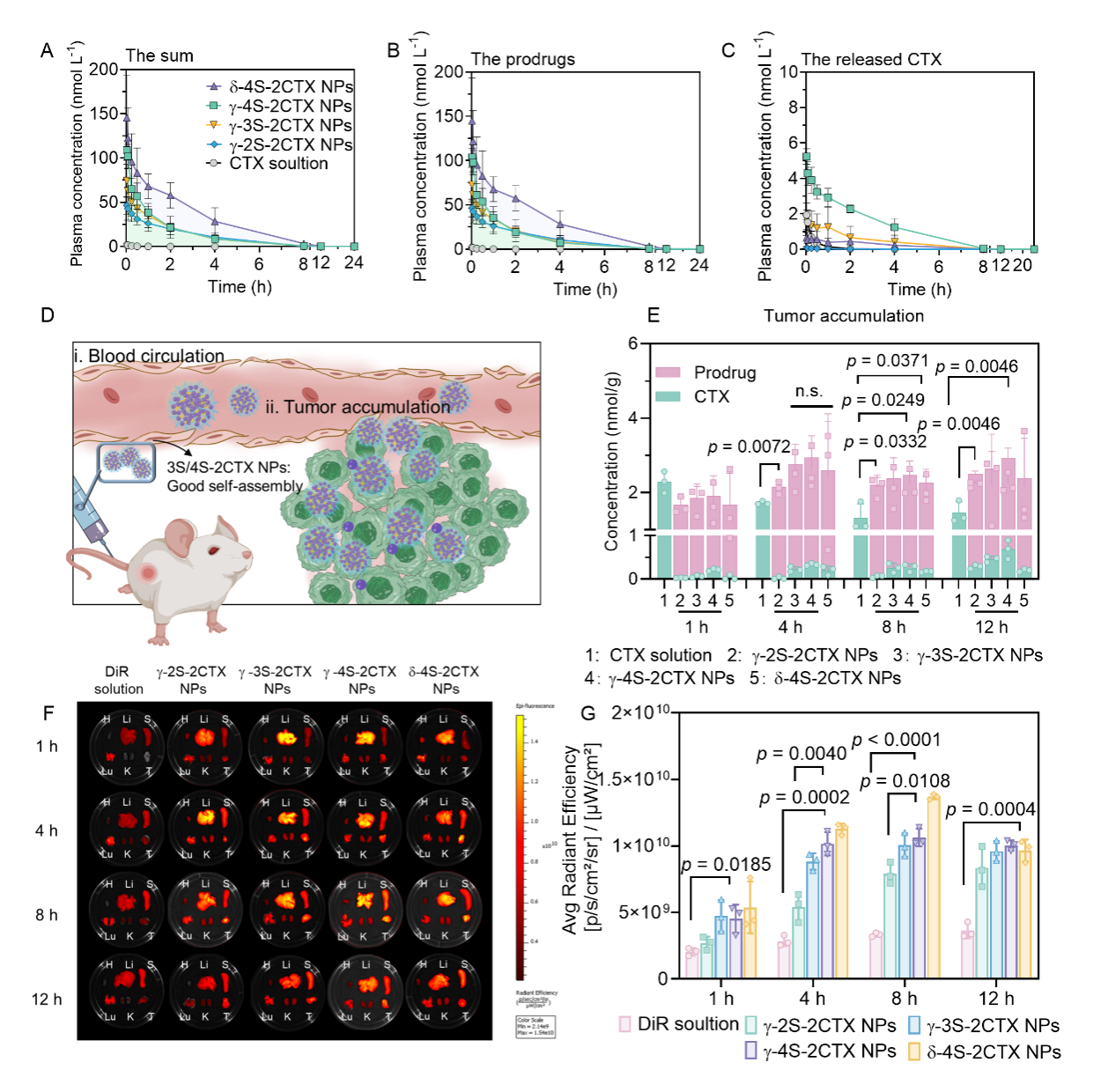 接下来,作者对前药自组装纳米粒的药动学行为和组织分布进行了考察(图4)。具有良好化学稳定性和自组装稳定性的四硫键保证了DPNAs在体内的稳定性,延长了血液循环时间,从而改善其肿瘤蓄积。