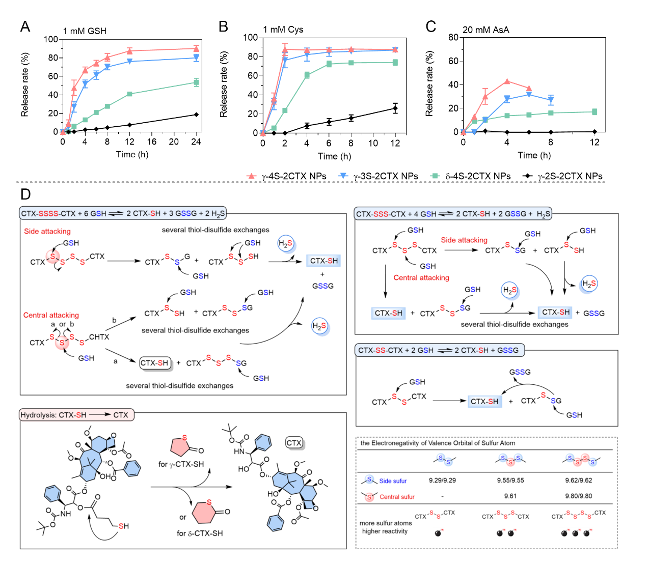 作者接着考察了前药自组装纳米粒的体外释放行为,结果如图3所示。γ-4S-2CTX NPs表现出超高还原反应性,对于多种还原物质(谷胱甘肽GSH、半胱氨酸Cys和抗坏血酸AsA)都具有良好的响应能力。与三硫键/二硫键相比,四硫键超高的还原反应性可归因于以下三点:(1四硫键的硫原子都表现出较高的价轨道电负性,表明它们非常容易受到GSH的亲核攻击;2四硫键具有更多的硫原子,尤其是活性更高中心硫原子;3)四硫键在还原反应过程中释放更多H2S,从热力学角度该反应更容易进行。