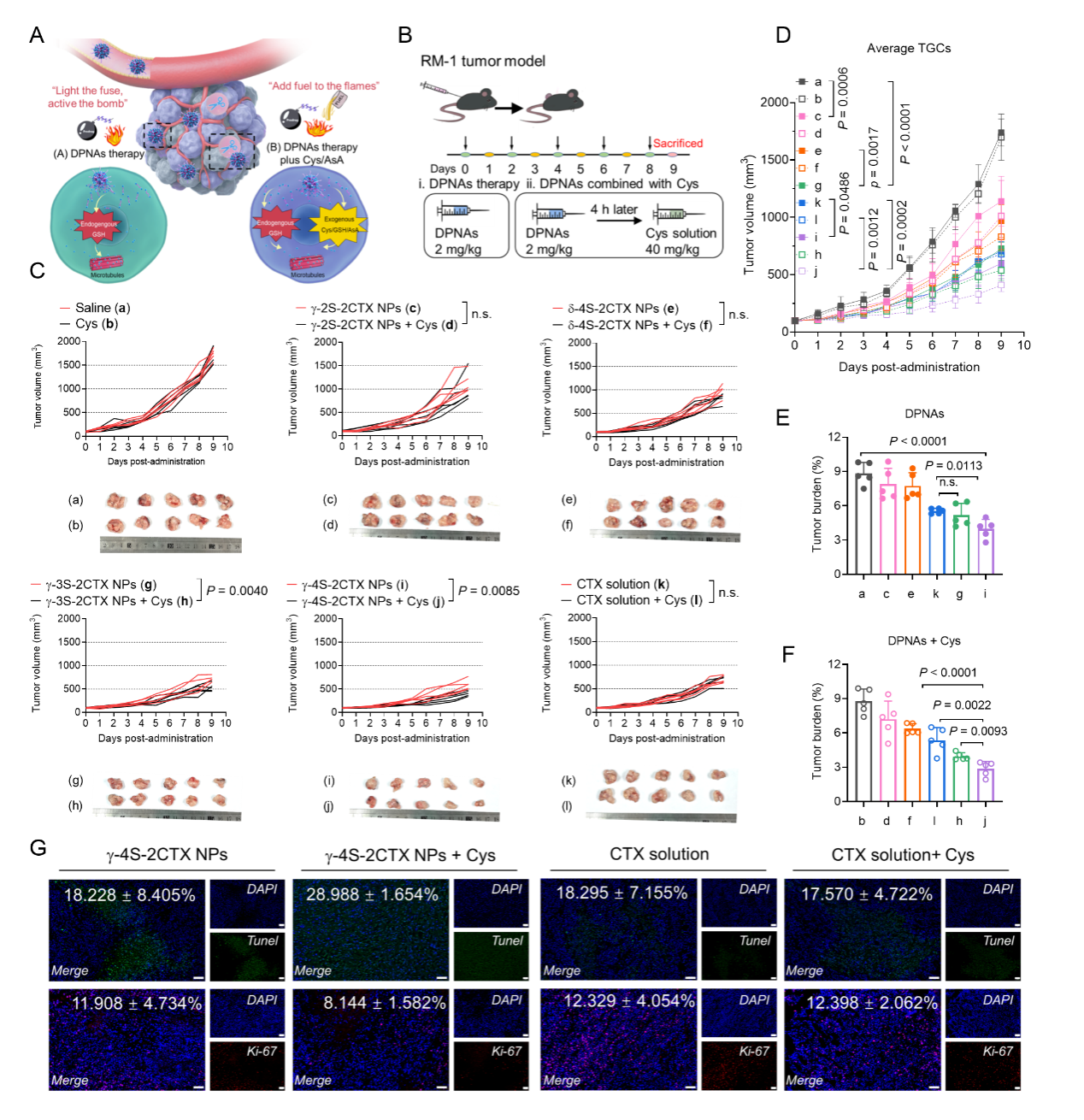γ-4S-2CTXγ-四硫键连接保证了其体内稳定性和安全性。同时,超高还原反应性的四硫键使γ-4S-2CTX NPs可以被肿瘤中的内源性GSH选择性地“引爆”,杀伤肿瘤细胞。为了充分发挥DPNAs的潜力,向肿瘤部位补充外源性还原剂,如同"火上浇油",进一步引发γ-4S-2CTX NPs的活化,从而获得更好的抗肿瘤效果。