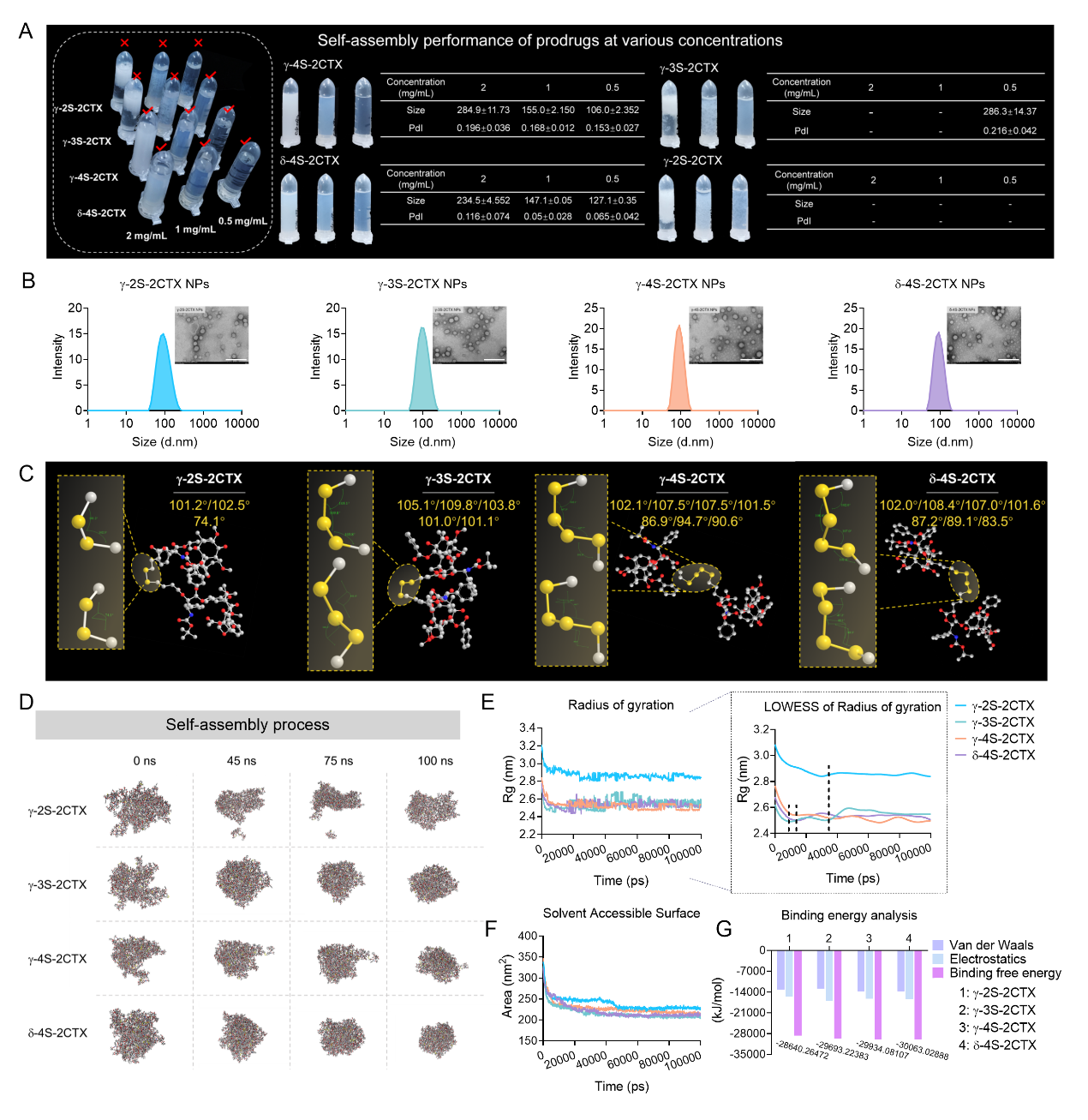 作者首先合成了一系列卡巴他赛二聚体前药,并对其化学稳定性及组装能力进行考察。结果表明,四硫键的引入使DPNAs在自组装方面具有明显优势,这对提高药物递送效率非常重要。通过对组装机制的探索,揭示了卡巴他赛二聚体前药结构-组装关系,解释了四硫键桥连DPNAs具有更好自组装稳定性机制(图2)。