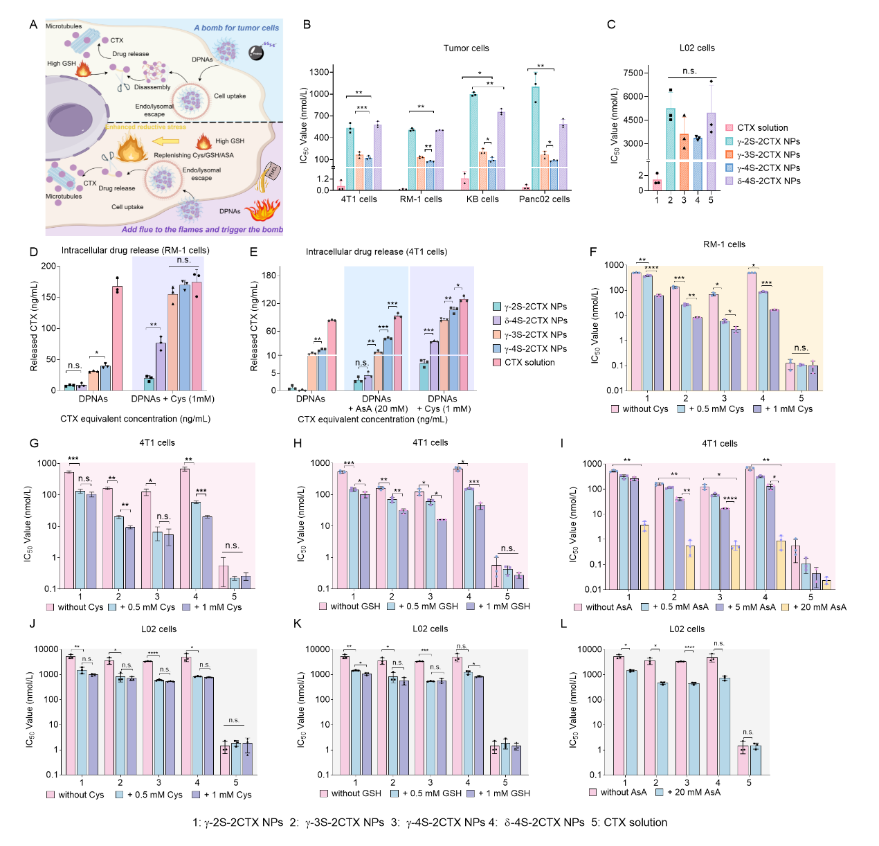 在这项研究中(图1,作者设计了一系列四硫键桥连卡巴他赛(CTX)二聚体前药,系统地考察了四硫键的化学位置对于DPNAs的影响。在综合化学稳定性和激活选择性等因素后,选择了最具潜力的γ-4S-2CTX,并设计了相应二硫键/三硫键桥连前药作为对照。与三硫键和二硫键相比,四硫键赋予DPNAs更强的自组装能力,保证了DPNAs在体内的稳定性。值得注意的是,四硫键具有超高还原反应性,使DPNAs成为高选择性的“肿瘤炸弹”,可以被肿瘤部位的高水平GSH选择性引爆,释放毒性CTX杀伤肿瘤细胞。此外,该团队还提出了一种火上浇油的策略,通过补充外源还原剂来进一步加强肿瘤部位的还原应激,加速γ-4S-2CTX NPs的活化,从而获得更好的抗肿瘤效果,并同时提高了其肿瘤选择性。