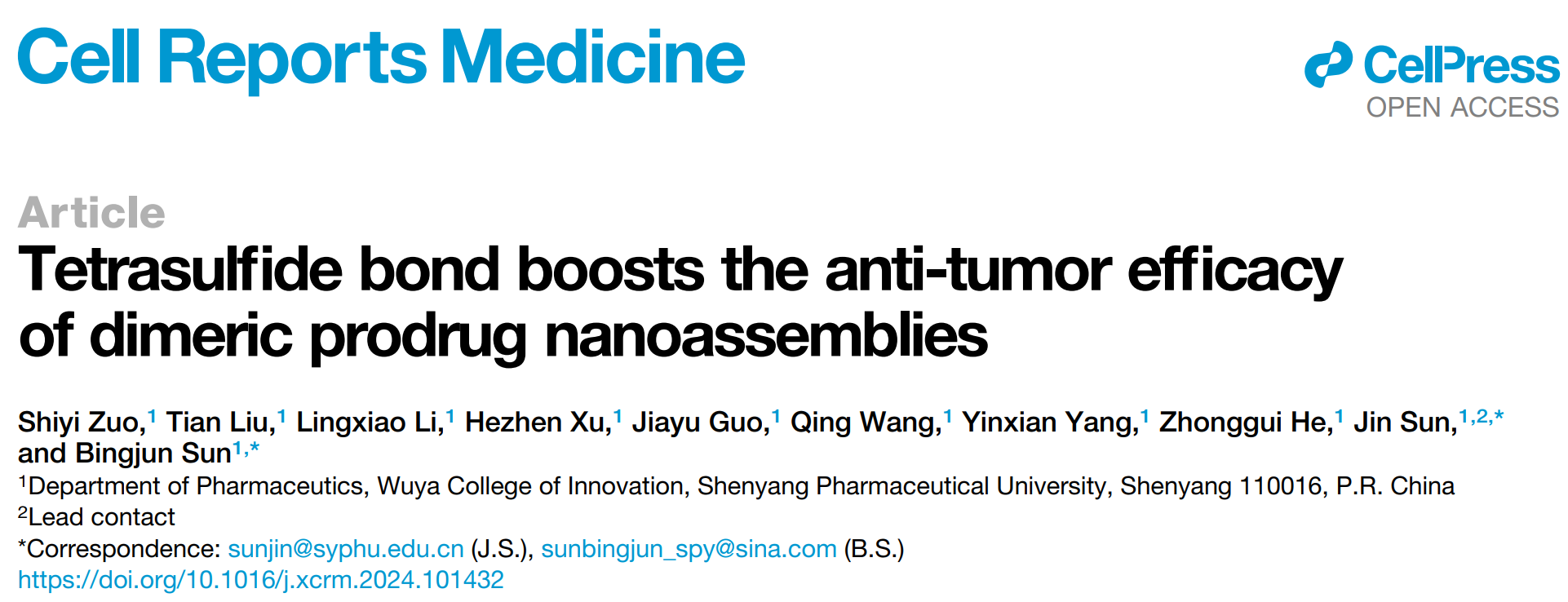 2024221beat365在线唯一官网孙进/孙丙军团队在Cell旗下子刊《Cell Reports Medicine》(IF=14.3)发表题为“Tetrasulfide bond boosts the anti-tumor efficacy of dimeric prodrug nanoassemblies”的研究文章进一步探讨四硫键在构建前药自组装纳米递送系统中的应用beat365在线唯一官网孙进教授和孙丙军教授为此文通讯作者,2021级博士生左诗意为第一作者,beat365在线唯一官网为唯一通讯单位。
