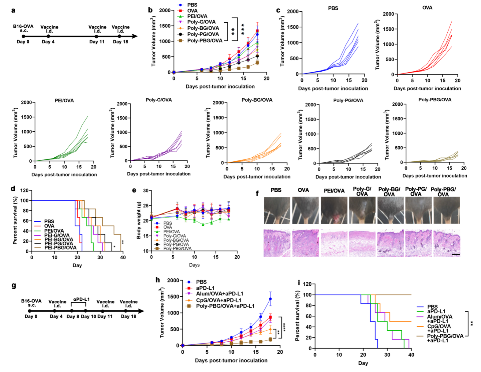为了进一步验证 PolyGu NV 诱导的特异性抗肿瘤免疫作用,作者研究了它们在表达模型抗原 OVA (B16-OVA) 的黑色素瘤小鼠模型中的治疗效果。 结果显示,用PolyGu NVs免疫的小鼠,尤其是用PG NVsPBG NVs免疫的小鼠,肿瘤生长率显着降低,这显着提高了小鼠的存活率。 此外,这些疫苗还展示良好的体内安全性 由于Poly-PBG NVs的良好应用潜力,作者进一步将Poly-PBG NVsPD-L1抗体结合,并将其与市售佐剂进行比较,结果显示 Poly-PBG NVs PD-L1 的组合优于 CpG/OVA PD-L1 的组合。
