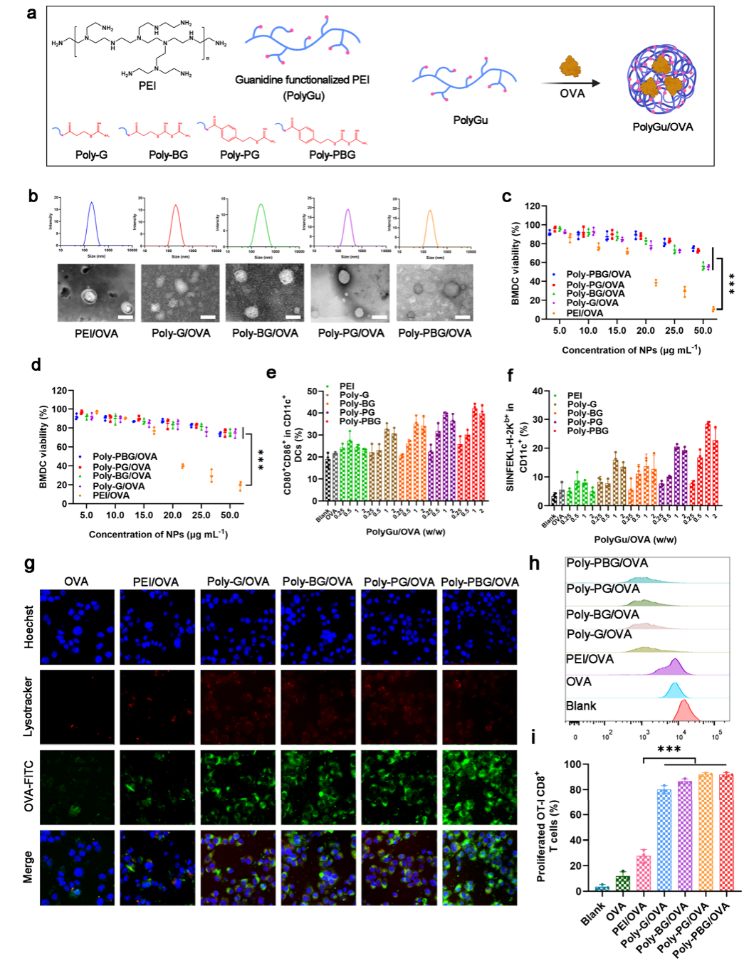 作者首先选择支链PEI作为主要框架,并用功能性胍基团对其进行修饰来构建多胍材料。随后,使用卵清蛋白 (OVA) 作为模型抗原制备了纳米疫苗。首先,作者使用小鼠骨髓来源性树突状细胞 (BMDC) 和巨噬细胞 (BMDM) 检查了胍修饰对 PEI 毒性的影响。结果显示,胍修饰大大减轻了 PEI 的毒性。进一步研究了胍 纳米疫苗对 BMDC 的免疫刺激作用。 结果发现,多胍NVs 可促进 DC 成熟,其共刺激分子 CD80 CD86 BMDCs 中显着上调,此外,多胍疫苗在促进 DC 抗原呈递方面也表现出更好的效率。这些免疫激活的提升可能与良好的摄取有关。在NVs 处理 DCs后,DCs在刺激 T 细胞增殖方面表现出显著提升的效率。