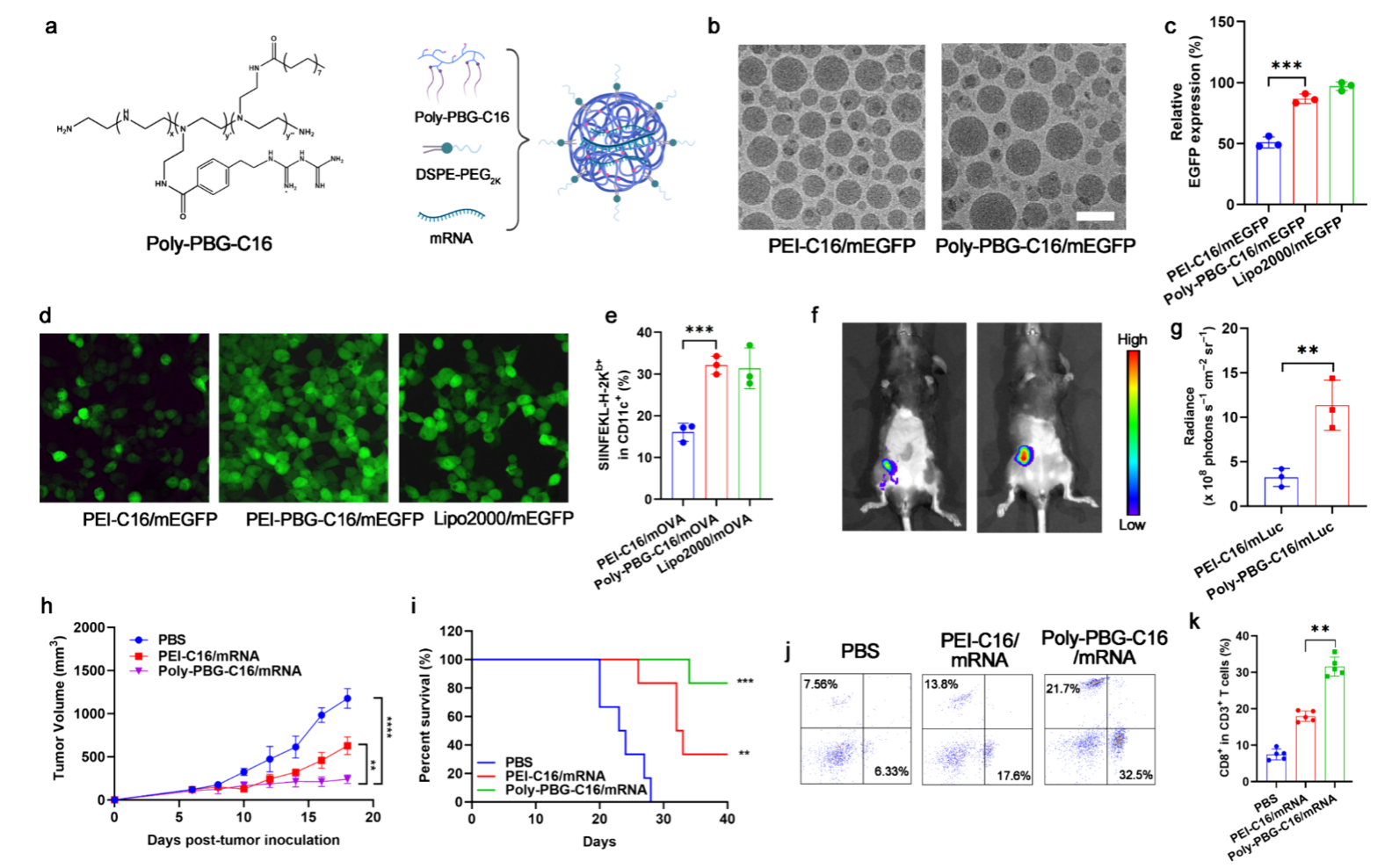 为了扩大基于PolyGu自佐剂的用途,作者探索了基于Poly-PBGmRNA载体效果 OVA mRNA作为模型,并使用十六烷酸(C16)将Poly-PBG修饰为Poly-PBG-C16,以提高mRNA的递送效率。 作者制备了 EGFP mRNA (mEGFP) NV,并使用 HEK-293T 细胞进行体外转染实验。 体外转染显示,Poly-PBG-C16接近Lipo-2000的效率。 mOVA NVs 考察了 BMDC 细胞模型中的抗原呈递效果,结果表明 Poly-PBG-C16 促进了抗原表达和呈递。 此外,用 Poly-PBG-C16/mOVA 免疫小鼠可诱导适应性免疫反应,显着抑制肿瘤生长,表明这种基于胍的佐剂材料可以作为 mRNA 疫苗的有效载体。