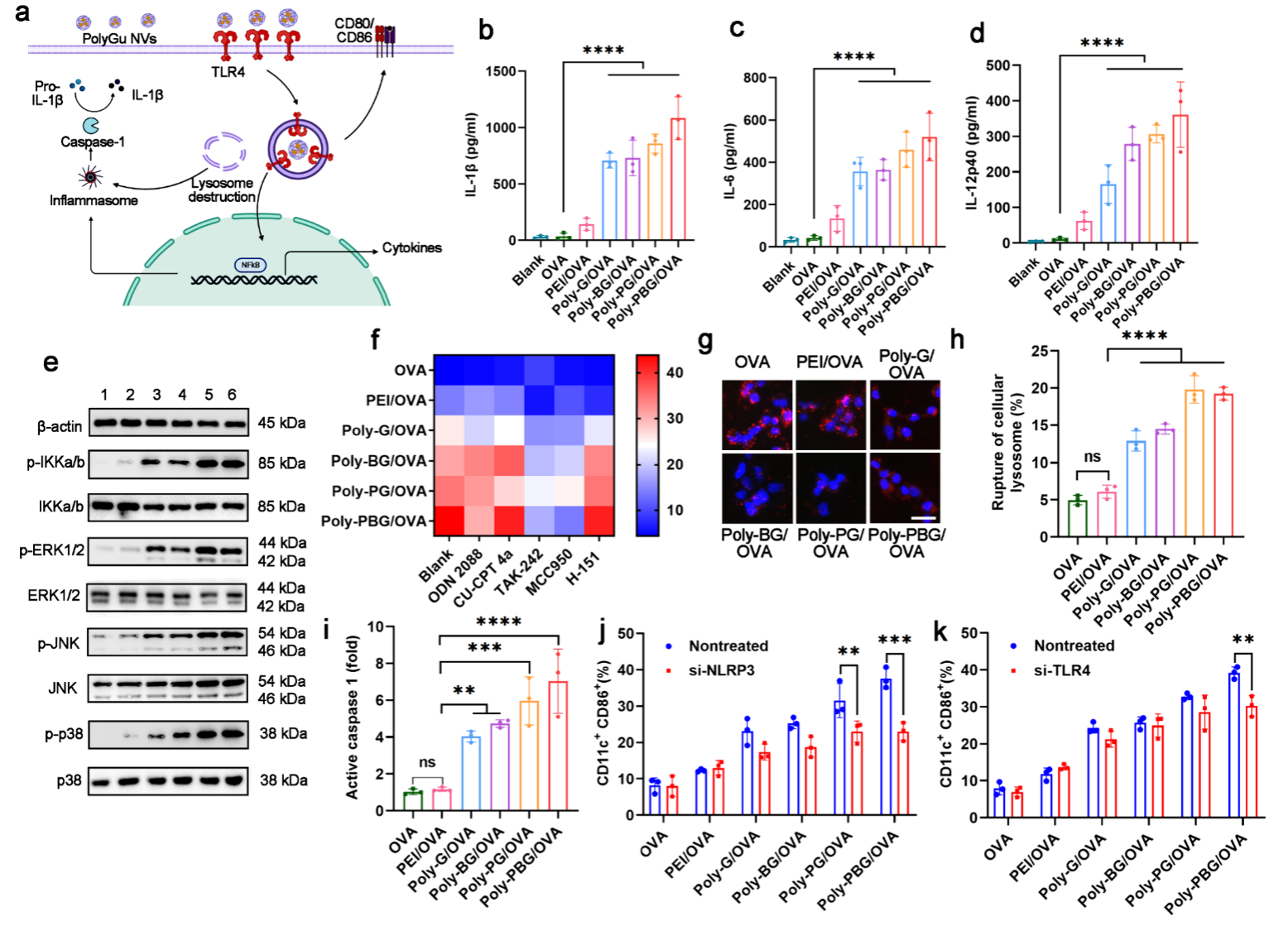 作者猜想这些富含阳离子的PolyGu NVs可以激活细胞内模式识别受体,从而促进DCs的成熟并通过下游信号通路促进抗原呈递。 因此,作者首先测量了经 PolyGu NV 处理的 DC 的细胞因子分泌情况。 结果显示PolyGu NV 显着增强 DC 分泌 IL-1βIL-6 IL-12。 因此,作者推测PolyGu NVsDCs的激活主要是通过丝裂原激活蛋白激酶(MAPK)途径实现的,并通过蛋白质印迹实验进一步验证了这一点。此外,利用几种典型的TLRSTING抑制剂进行验证,结果显示TLR4抑制剂和NOD样受体3NLRP3)抑制剂显著减少PolyGu NVDC的激活。