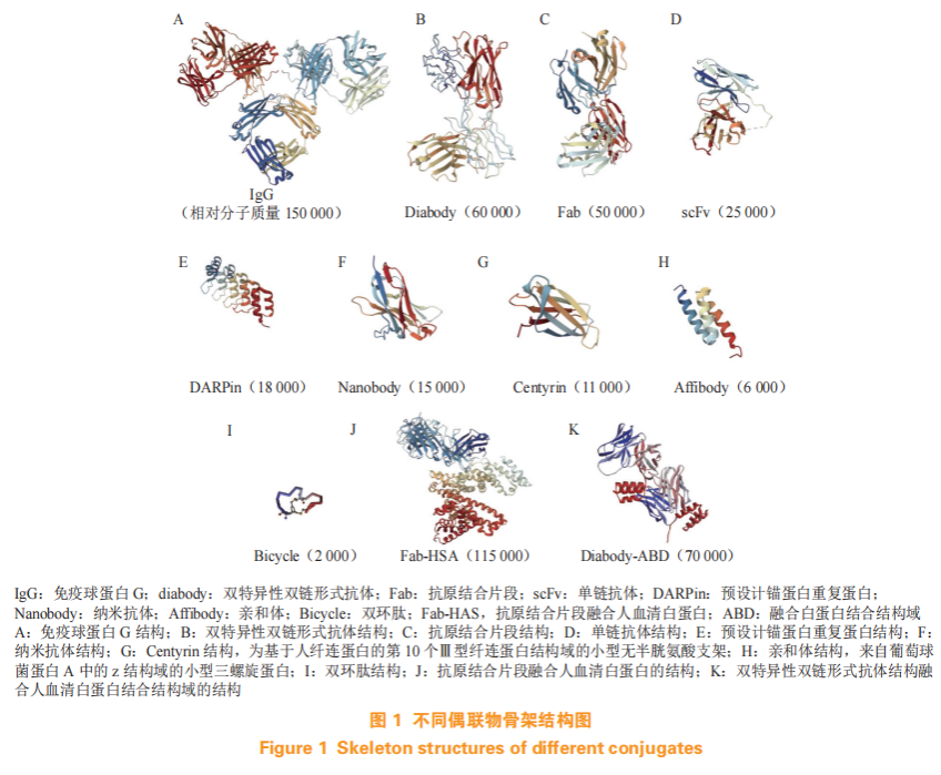 2.2.1 亲和体偶联物 亲和体是一类由 58 个氨基酸构成的、具有反平行的三螺旋折叠的小分子量蛋白,是一种非免疫球蛋白形式的亲和蛋白,其相对分子质量为 6 500 左右[34],结果如图 1 H 所示。目前,采用第一代 Affibody 支架构建设计的靶向人表皮生长因子受体-2(human epidermal growth factor receptor 2,HER2)的正电子发射型计算机断层显像(positron emission computed tomography,PET)诊 断试剂 ABY-025 已进入Ⅱ期临床阶段[35]。由于相对分子质量较小,这类药物可以实现在肿瘤中快速分布和在肾脏中的快速代谢,是一类理想的靶向诊断试剂,但作为治疗性药物来说,存在着肾小管重吸收的问题[36],如果制备成偶联物,可能会增加其肾脏不良反应。在构建 Affibody 为骨架的靶向放疗药物时,Affibody AB 公司的研发团队将 Affibody 骨架与 ABD 融合,从而延长血浆半衰期并减少肾脏的摄取[37],同时将其中的 ZHER2:324 优化为第二代支架 ZHER2:2891,可增加其亲水性和热稳定性[34],且比较了 2 种在 ZHER2:2891 C 端融合 ABD 的药物——放射性药物[ 177Lu]Lu 偶联在 C 末端的 ABY-027 和偶联在 ABD 第 14 位的 ABY-271,筛选出肿瘤肾脏分布比更高的[ 177Lu]Lu -ABY-027[38],目前正在进行与曲妥珠联合用药的体内活性研究[39],除此之 外,根 据 Affibody AB 官网显示[35],[ 177Lu]Lu -ABY-271 正在临床申报阶段[35]。瑞典乌普萨拉大学 Orlova 团队也利用该类骨架,开发 Affibody 偶联物,在骨架末端引入半胱氨酸,制备美登木素生物碱 1(mertansine DM1,DM1)、一甲基澳瑞他汀 E (monomethyl auristatin E,MMAE)和一甲基澳瑞他汀 F(monomethyl auristatin F,MMAF)偶联药物[40],与 ABD 进行融合,将部分肾脏代谢转变为肝代谢[40];在骨架末端半胱氨酸前,使用 3 个谷氨酸作为间隔以降低动物体内肝摄取[41-42],构建 DAR 为 1 和 3 的 Affibody 偶联物,目前 DAR 为 3 的药物虽体内药效较好,但肝、脾、骨的非特异性摄取更多;也考察了不同结构域排列[43]、骨架与 ABD 间不同蛋白连接肽连接子长度的影响[44],目前,该偶联物还在进行临床前优化阶段,没有明确的最优分子。