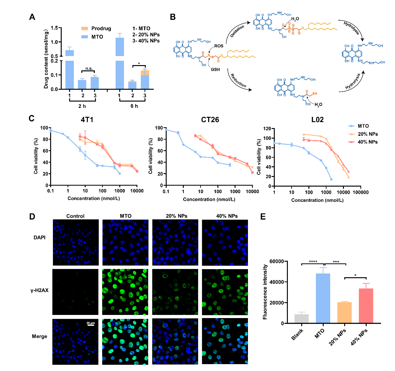 接下来,作者对纳米粒的体内命运进行研究。40% NPs因其更小的粒径和更好的组装稳定性,在血液循环中展现了更长的滞留时间和更高的肿瘤蓄积,同时仅有少量米托蒽醌在血液循环过程中从前药中释放来。这有望在保证治疗效果的同时降低与米托蒽醌相关的脱靶毒性。(图4)