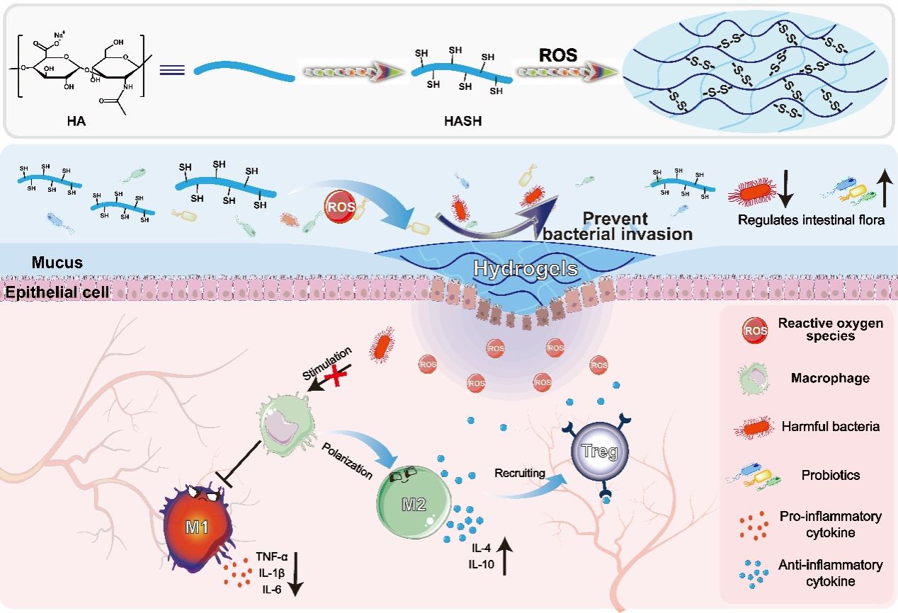 在这项研究中,作者设计了一种由硫醇修饰透明质酸(HASH)组成的ROS响应性水凝胶前体溶液。该溶液能够顺利通过上消化道,并在肠道炎症部位有效地响应ROS,形成水凝胶屏障,阻止微生物入侵并减少异常激活的免疫反应。小鼠饮用该溶液后,有效缓解了DSS诱发的体重减轻、结肠长度缩短和免疫细胞浸润等急性和慢性IBD症状。此外,该水凝胶前体溶液还通过调节细胞旁分泌和改变肠道菌群组成,缓解肠道炎症,促进肠道屏障功能恢复。该研究为可饮用水凝胶的合理设计提供了新见解,为人工黏液屏障的开发和IBD的口服治疗提供了一条新思路。