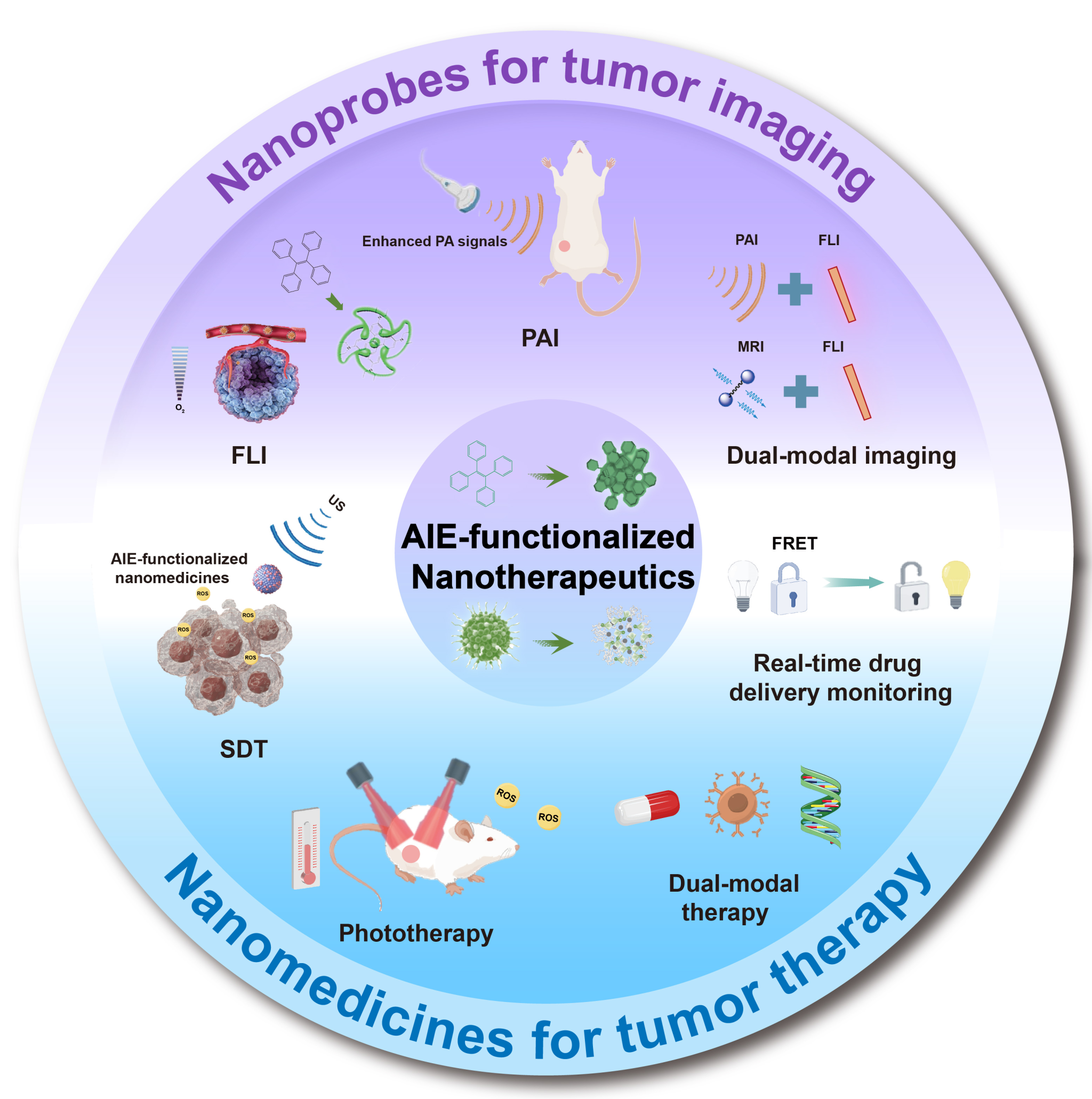 近年来,基于聚集诱导发光(Aggregation-Induced Emission,AIE)现象的荧光探针在癌症等疾病诊断中备受关注。此外,一系列功能性AIE荧光物质(AIEgen)被设计开发为用于肿瘤治疗的光热或光动力光敏剂。值得注意的是,AIE聚集发光特性与纳米结构形成具有天然的联系。正因如此,基于AIEgen开发新型功能性纳米探针和纳米药物已经成为癌症精准诊断和治疗领域的前沿热点方向。