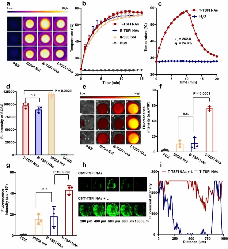 考察了T-TSFI NAs的体外特性和体外溶栓能力。首先,验证了其体外光热和光动能力,发现其具备良好的体外升温能力,与TSF共组装后并没有影响IR808的光热转换效率,并且其产生1O2的能力较强。此外,渗透实验结果表明光热显著促进药物的深部渗透。(如图3所示)