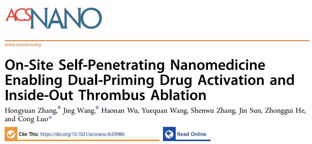 近日,beat365在线唯一官网罗聪教授团队在《ACS Nano》(IF=15.8)在线发表了最新研究成果“On-Site Self-Penetrating Nanomedicine Enabling Dual-Priming Drug Activation and Inside-Out Thrombus Ablation”。该研究提出了一种基于光热/光动双效光敏剂与氧化响应抗血小板前药共组装实现多模式激活抗血栓前药的新策略,有望解决血栓ROS异质性导致的前药激活瓶颈难题。在该研究中,作者首先设计合成了一种抗血小板药物替格瑞洛(TGL)的氧化响应前药(TGL-S-Fmoc, TSF)。随后,发现TSF可以与光热/光动双功能的光敏剂IR808共组装形成稳定的纳米结构。基于此,作者开发了一种自穿透、自激活、多模式协同的无载体纳米组装递药系统(T-TSFI NAs)。在光热效应的辅助下,T-TSFI NAs不仅能够实现血栓的深部穿透,还通过产生ROS协同内源性ROS触发前药按需激活,栓块内部释放抗血小板药物TGL,从而实现光热/抗血小板协同溶栓。T-TSFI NAs在FeCl₃诱导的大鼠颈动脉血栓模型中不仅有效抑制了血小板的激活和聚集,还显著降低了出血风险。这一策略成功克服了血栓微环境中ROS分布不均的难题,为抗血栓前药按需高效激活提供了新思路。