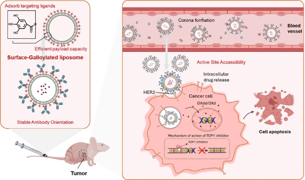 在肿瘤治疗和精准药物递送领域,靶向纳米载体因其高选择性和疗效潜力而备受期待。然而,蛋白冠效应会掩盖表面修饰的配体,导致靶向性丧失;同时,传统的抗体化学偶联工艺复杂,存在免疫原性风险和产业化障碍。这些瓶颈长期阻碍了主动靶向纳米药物的临床转化。近日,beat365在线唯一官网王永军教授团队在Nature Communications发表研究成果,报道了一种基于没食子酰基修饰脂质的表面没食子酰基化脂质体(Galloylated liposomes, GA-lipo)。该体系通过非共价方式稳定吸附抗体,实现抗体Fab端定向暴露,且不受蛋白冠遮蔽影响,在动物模型中验证了该策略的高效靶向递送和显著抗肿瘤疗效。