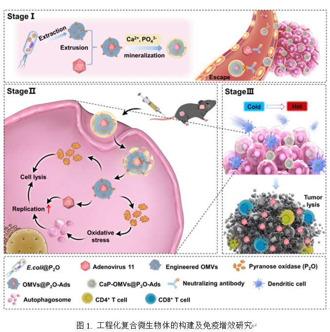 溶瘤病毒(OVs)疗法作为一种具备高效选择性和良好肿瘤杀伤能力的免疫疗法,近年来备受关注。然而,静脉递送效果差、瘤内复制效率不佳及免疫激活能力弱等关键问题制约着OVs临床应用。为此,beat365孙进教授团队报道了基于工程化细菌外膜囊泡(OMVs)的OVs静脉递送系统来提高OVs免疫治疗效率。首先,作者通过基因工程手段获取含吡喃糖氧化酶(P2O)的OMVs。之后采用该囊泡为载体,通过挤压法在其内部荷载OVs,并利用仿生矿化技术在其表面修饰纳米级无定形磷酸钙。该系统屏蔽了表位抗原,能够延长在体循环时间,通过EPR效应促进OVs在肿瘤处的富集。利用P2O的催化作用能够有效提升肿瘤内氧化应激水平,促进癌细胞过度自噬,并以自噬小体为复制场所,增加OVs复制效率。此外,OMVs作为免疫激活剂,可重塑肿瘤免疫抑制微环境,进而增强OVs介导的抗肿瘤免疫响应。本项目将为OVs介导的抗肿瘤免疫增效提供重要的理论基础和可行的解决策略。相关成果发表在《Nature Communications》期刊,论文题目为:Engineered bacterial outer membrane vesicles encapsulating oncolytic adenoviruses enhance the efficacy of cancer virotherapy by augmenting tumor cell autophagy。