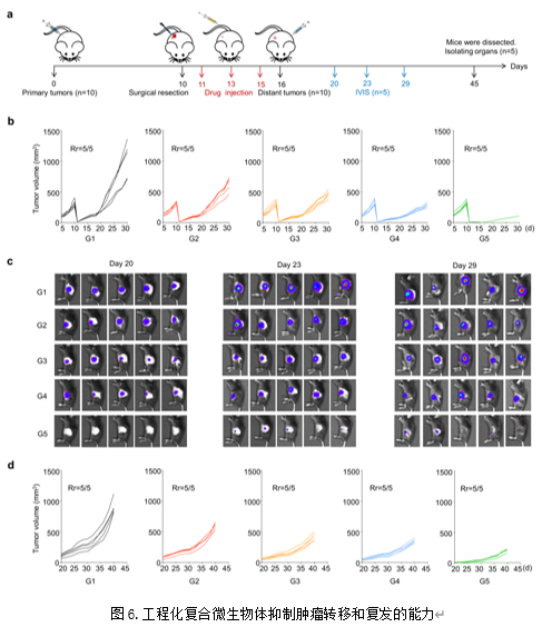 为考察工程化复合微生物体对微小肿瘤灶及肿瘤转移灶的治疗效果,作者构建了相应的复发和转移的模型(图6a)。结果显示,工程化复合微生物体具有最佳的抑制肿瘤组织复发和转移的能力(图6b-d)。