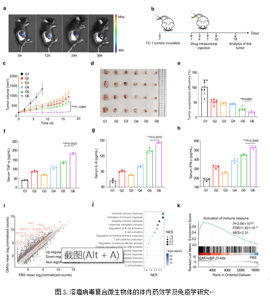 作者构建了TC-1异位瘤肿瘤模型,考察了瘤内注射溶瘤病毒复合微生物体后的瘤内蓄积情况(图3a),结果显示制剂能在肿瘤处蓄积超过36 h且不会向四周组织扩散。在此基础上作者考察了瘤内注射复合微生物体后抑制肿瘤组织生长的能力。结果显示,相比于单纯的Ads及OMVs,工程化细菌外膜囊泡荷载溶瘤病毒的复合微生物体具有最佳的抗肿瘤能力(图3b-e)。随后评估了制剂激活肿瘤处及周身免疫反应的能力。流式细胞术、Elisa测试及基因测序结果均证明,溶瘤病毒复合微生物体能最有效地激活周身抗肿瘤免疫应答(图3f-k)。