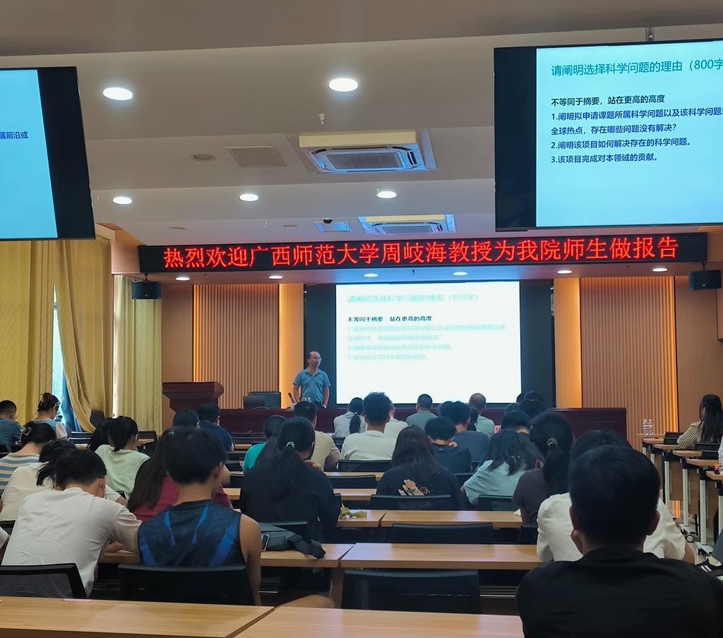 9月21日,广西师范大学周岐海教授在格致楼101室为我校师生做国家自然科学基金申报报告。002cc白菜资讯化学专业部分教师及学生参加本次报告会,报告会由院长李晓东主持。