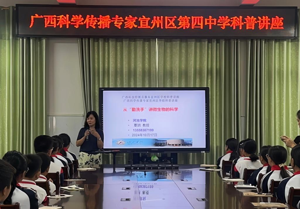 10月17日,广西科学传播专家库入库专家、广西科技特派员、002cc白菜资讯教授覃玥应河池市宜州区科学技术协会邀请,到河池市宜州区第四中学开展微生物科普知识进校园活动,为师生作《从“勤洗手”讲微生物的科学》专题讲座。