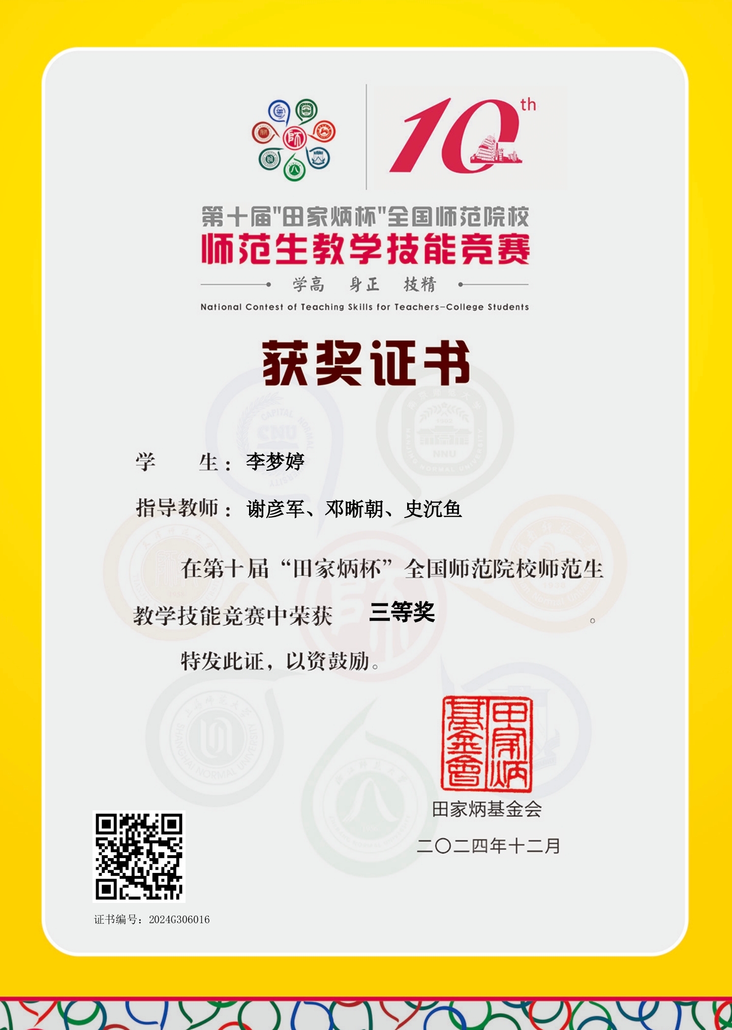 近日,第十届“田家炳杯”全国师范院校师范生教学技能竞赛圆满落幕。本次竞赛共有来自250所高校1831名选手参加,经过大赛的激烈角逐,002cc白菜资讯2021级生物科学专业李梦婷同学喜获高中生物组三等奖,2022级生物科学专业张小燕同学喜获科学组优胜奖。