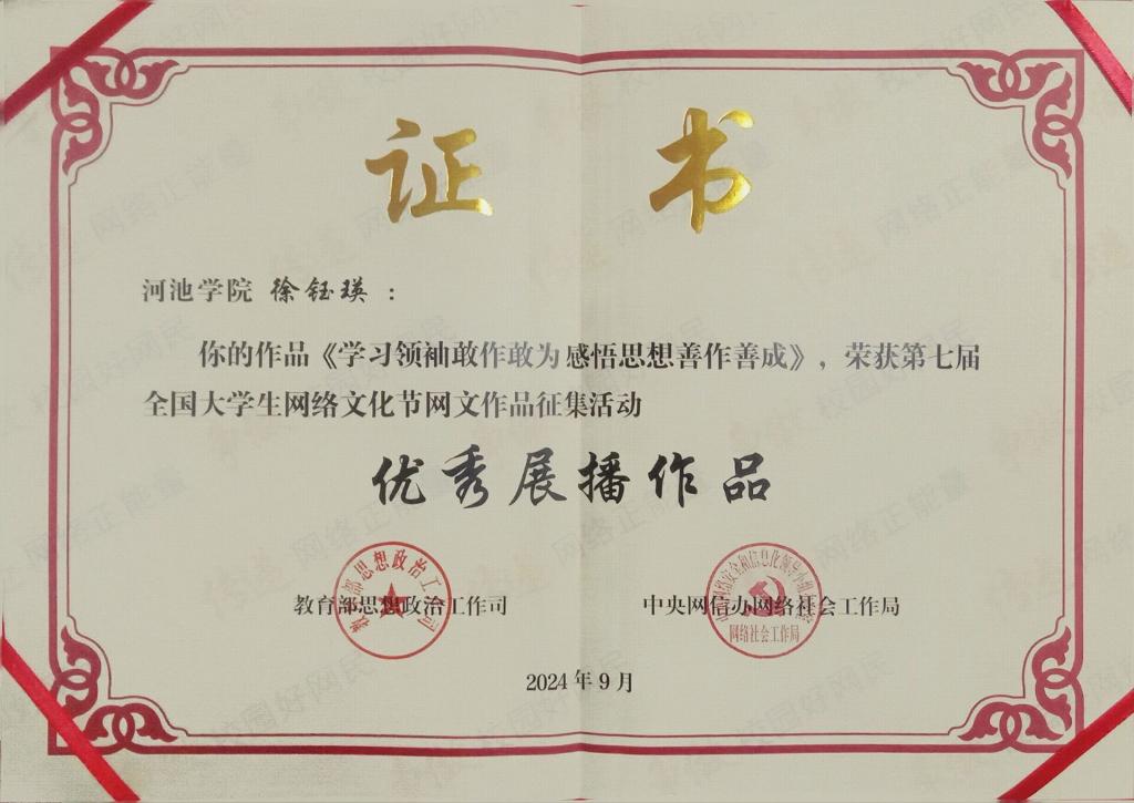 徐钰瑛同学在本次活动中取得的荣誉,既是对个人努力和才华的认可,也是对其在思想政治教育和网络文化创作方面积极探索的肯定。白菜资讯官网将继续鼓励师生积极参与网络文化创作,营造良好的网络文化氛围,培养更多优秀的网络文化人才。(作者:劳心妍 拍摄:劳心妍 校对:劳旻旻 审核:覃宝山)