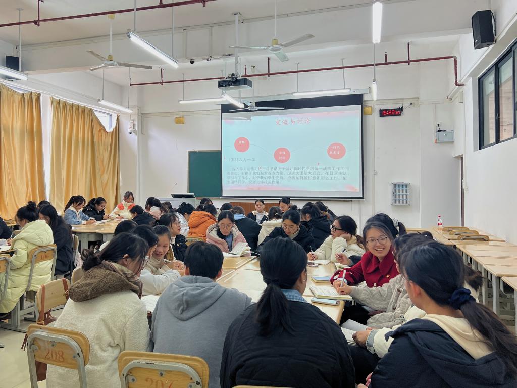 为深入学习习近平总书记关于意识形态工作和党的统一战线工作的重要论述,12月11日,002cc白菜资讯学生党支部顺利举行以“新时代思想引领,统一战线新征程”为主题的读书沙龙活动。本次活动由学生党员陆雪梅同志主持,各学生党支部党员和入党积极分子参加活动。